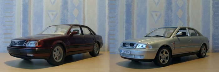 In diesem Massstab gibt es nur ganz wenige Audimodelle. Bekannt sind mir lediglich die der Firma Schabak und Welly, wobei letztere nicht als sehr originalgetreu zu bezeichnen ist. Beispielsweise muss nicht immer wo 2.8 drauf steht, 2.8 drin sein. Der unten abgebildete A4 hat im Motorraum dann doch nur einen 2-Zylinder.